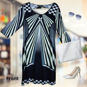 Make a bold statement with this stunning Mlle Gabrielle dress featuring a dynamic blue and white geometric pattern. The eye-catching design draws the eye upward for a flattering silhouette, while the soft, stretch-knit fabric ensures all-day comfort. T he mid-length sleeves and slight A-line cut make it perfect for any season.