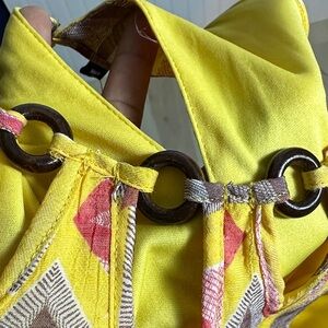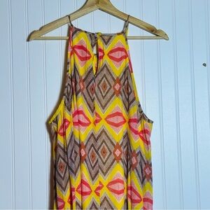 Vibrant maxi dress with geometric patterns. Features yellow, pink, and brown hues, pull over style with a keyhole on the Back. New with Tag! Nice wooden detailing around neck area.