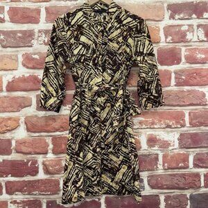 ▪️ Women’s Dress: Round neckline, button front closure, abstract pattern, double front pockets, elasticized tie waistline, and ¾ roll-tab sleeves. Pre-owned. Wear it with your favorite flats or heels!