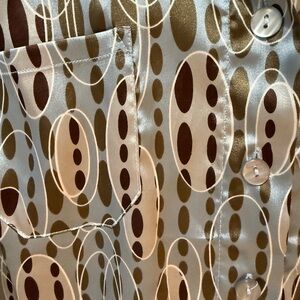 This dress has belt loops. It was look amazing w a brown leather belt! Elegant dress with a pattern. Features brown and blue cream tones. Ideal for a sophisticated style.
