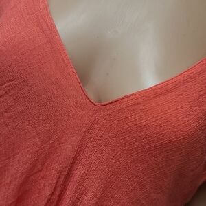 Beautiful light weight coral beach dress, perfect for a hot summer day, on the beach as a cover up or just like is as a very comfortable breezy dress featuring a double v neckline, adjustable straps, astronomical style cut having a some what train. Size 2x. Excellent gently used condition.