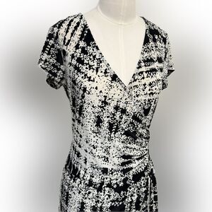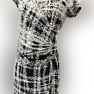 This elegant dress features a striking black and white pattern, perfect for any occasion. The design offers a sophisticated look that is both stylish and versatile. In good condition. Items are cross posted.