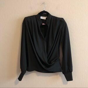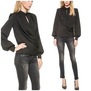 A drape-front MLM LABEL blouse with long sleeves and triple-button cuffs. The padded shoulders, crossover front, and center back pleat create a voluminous look. Snap front placket.