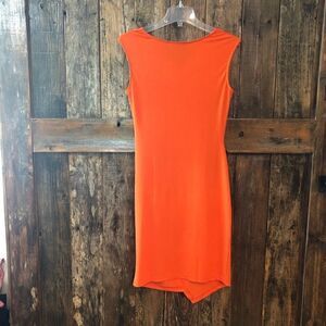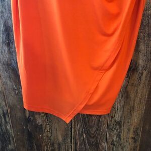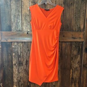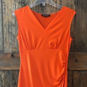 Beautiful body con midi orange dress with flattering ruching.