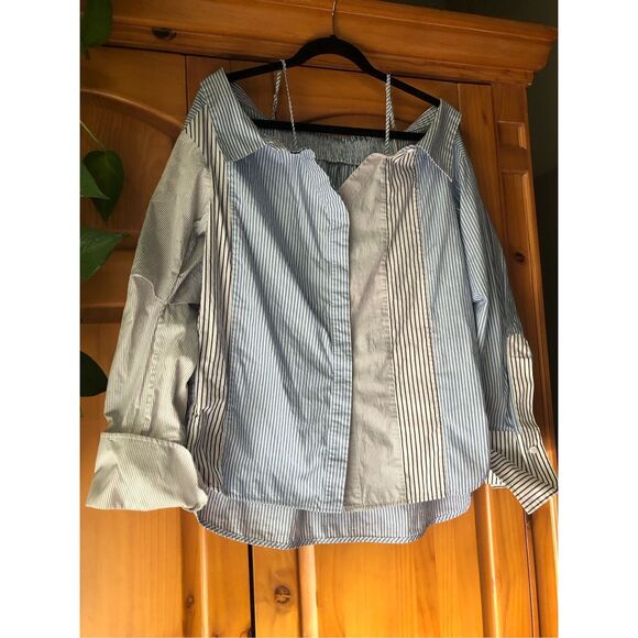 Mo&Co cool girl style contemporary striped patchwork cut shoulder Botton down women’s shirt size large, check the measurements for