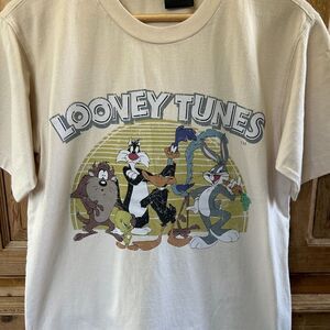 Features: Very cute basic graphic tee. Short sleeves. Crewneck. Graphic printed "Looney Tunes" in classic font with the whole gang below. Tasmanian Devil, Sylvester, Tweety Bird, Daffy Duck, Road Runner, Bugs Bunny. Slightly distressed around the neckline and sleeve openings.