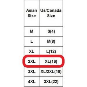 Labeled Asian size XXL, which is actually size 16 / XL in US sizing; see size chart image, & measurements below