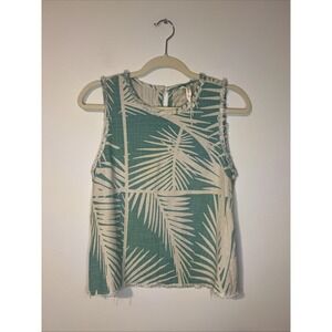 Mo:Vint New York Palm Leaf Print Linen Ruffled Raw Edge, Sleeveless Top, Size S