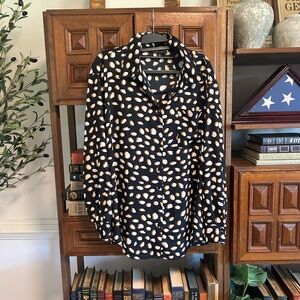 Chic black top featuring gold and white abstract patterns. Ideal for versatile styling. Good condition Size is XL Button down