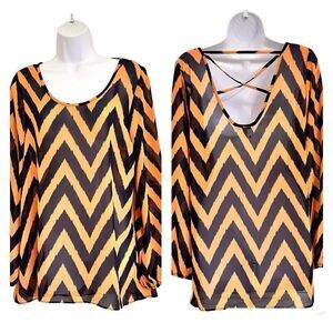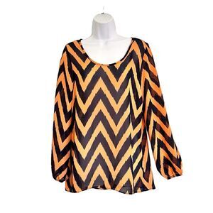 Moa Moa Blouse Top Size M Long Sleeves Chevron Pattern Semi Sheer Orange Navy