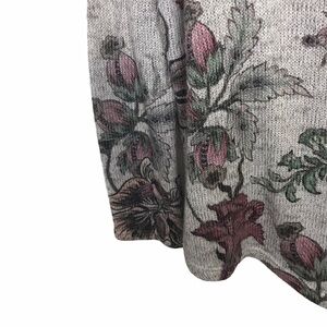 Gray sweater with pink flowers. Has a slanted hem. Preowned but in good condition. Missing material tag.