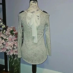 Grey sweater with black lace from moa moa. size S. Light breathable fabric that is soft to the touch.