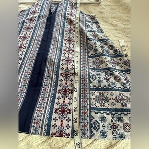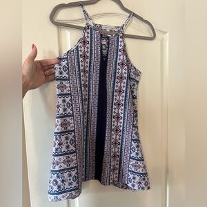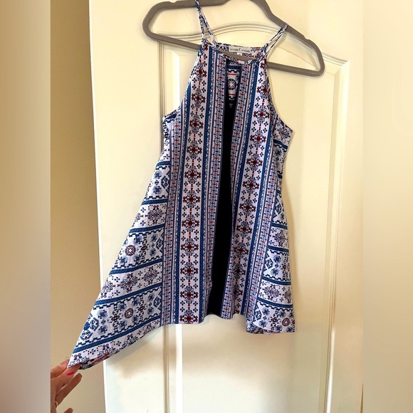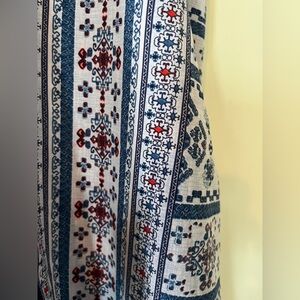 EUC excellent quality & condition. Sleeveless, hi neck strap blouse by Moa Moa. Beautiful colors- mostly navy & white with hints of red. Measurements in photos. Women’s size XS. Smoke free home