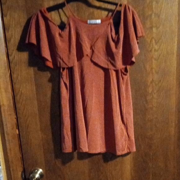 Soft ruffle overlay across the shoulders. Cold-shoulder straps with flutter sleeves. Relaxed, flowy tunic silhouette. Easy-to-style rust tone for casual looks.