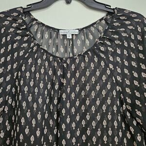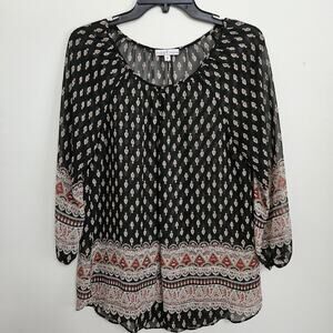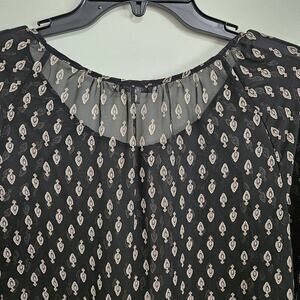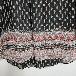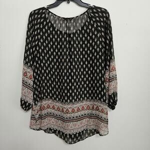 The Moa Moa Sheer BOHO Peasant Top Blouse in black with a contrasting border is a versatile and stylish piece perfect for various occasions such as travel, casual wear, workwear, and business settings. Made of lightweight chiffon fabric, this tunic-style blouse features a scoop neck, long sleeves with raglan sleeves, and a keyhole neck detail. The paisley pattern, gypsy-inspired character, and bohemian theme make it a trendy and easy-to-care-for addition to any wardrobe. Ideal for all seasons, this blouse is a must-have for those who appreciate hippie and peasant fashion. Like new condition.