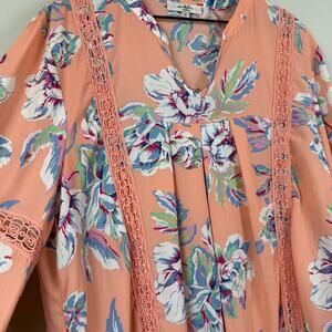 Moa Moa Top Women 2X Peach Floral V-Neck Long Sleeve Blouse Cottage Crochet Trim