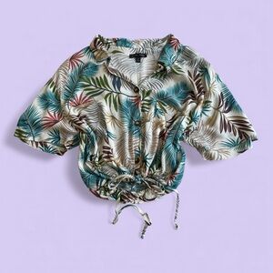 Lightweight chiffon blouse with a tropical white and green floral print. Features a collared neckline, full buttoned front, front pocket, cropped length, and adjustable tie at the waist for a flattering fit. Made from 100% rayon, breezy and perfect for summer styling or vacation looks. No major flaws noted.