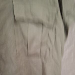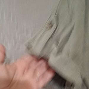 Stylish olive button-down with rolled sleeves. Features two front pockets.