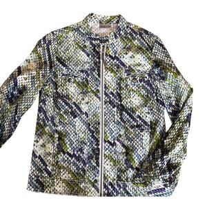 Excellent condition multi colored pattern with a bit of sparkle. 99% cotton & 2% spandex full zip front. Snap collar, wrists and pocketed denim jacket.