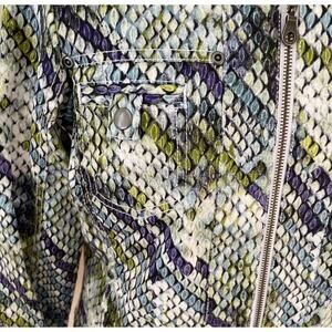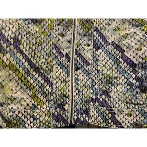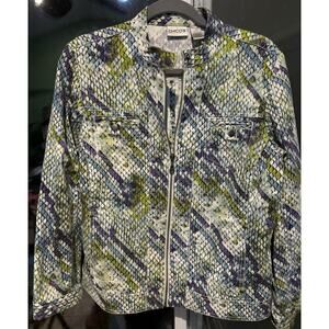 Excellent condition multi colored pattern with a bit of sparkle. 99% cotton & 2% spandex full zip front. Snap collar, wrists and pocketed denim jacket.
