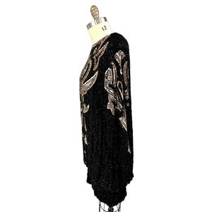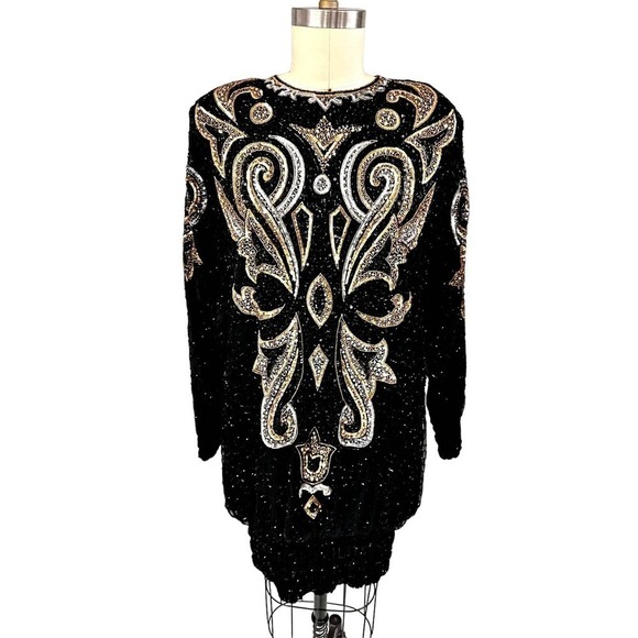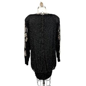Vintage 80s Lillie Rubin Sequined Silk Dress Black with Shoulder Pads, Back Zipper. Sz L