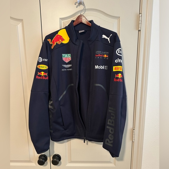 - Red Bull graphic print; AMRBR Team logo print; Dynamic Bull graphic print; printed Team partner logos; PUMA Cat logo print; hand pockets; regular fit