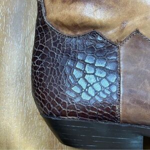 These brown heeled boots showcase a timeless Western design with intricate stitching on the shaft. Crafted from distressed leather, they offer a vintage charm and a pointed toe for a classic look. The boots reach mid-calf, combining style and comfort effortlessly.