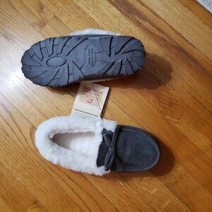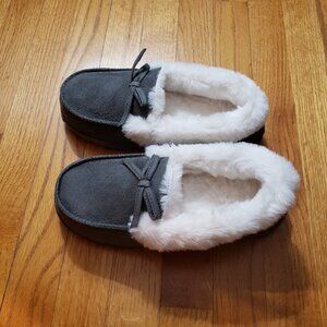 Gray Dena Lives moccasin slippers with comfy micro suede, memory foam. White faux fur with a little bow in front. These are brand new slippers with tags still attached. I bought them online and they didn't fit right...forgot to return before return window closed.