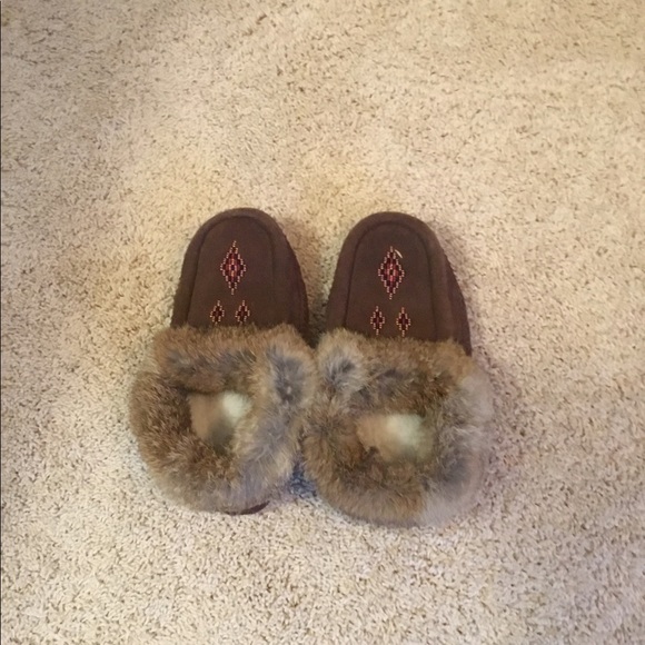 Manitobah Mukluks Made in Canada Moccasins. Brown leather with rabbit fur. Gold, blue and burgundy beading. Size 6