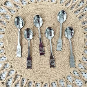 From Moccaskedar. Set of 6 Silver 18/8 marked coffee tea spoon set in original box. Floral design on spoon and moose crown on handle. Comes in original box. Preowned in good condition with no stains or tears.