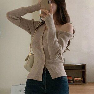 Mocha Brown Casual Womens Solid Asymmetrical Neck Button Through Ribbed Knit Ca…