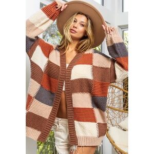 Mocha Brown Combo Checker Block Knit Cardigan Sweater