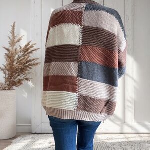 Mocha Brown Combo Checker Block Knit Cardigan Sweater