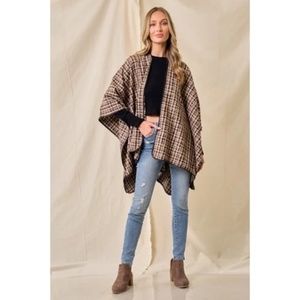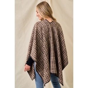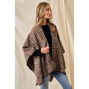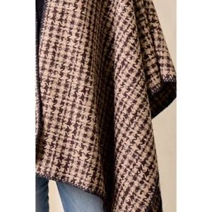 Mocha Brown Houndstooth Knit Shawl Open Poncho Wrap Casual Fall Winter One Size