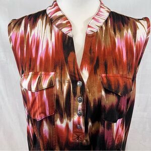 Vneck Henley style top with silver buttons. Breast pockets. Short cap sleeves. EUC