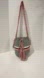 Stylish gray knit shoulder bag with pink and cream accents. Features a braided strap and tassel details.