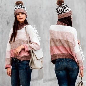 Beautiful Color Block Mock Neck Chenille sweater. Brown high mock neck with horizontal stripes of ivory, tan, light pink, pink, and light & dark brown. The colors are so pretty. Upstream soft chenille, not too long of a sweater, sits right past waist; it’s perfect. Can be dressed up or down. Something I haven’t seen before, had to have it.