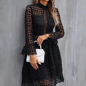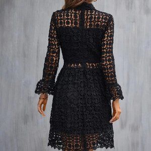 Mock Neck Flounce Sleeve Lace Black Dress