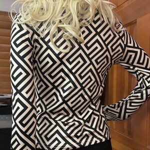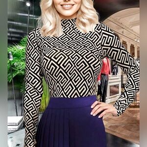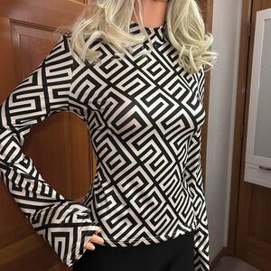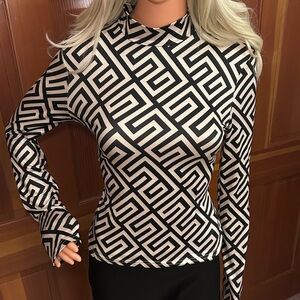 NWT, Lavishly Paris Elegant Balmaini “Greek Key" Print Pattern Long Sleeved Tee. women’s sophisticated top. Flattering body-contouring fit. Made from a blend of polyester and elastane, offering a comfortable stretch fit.