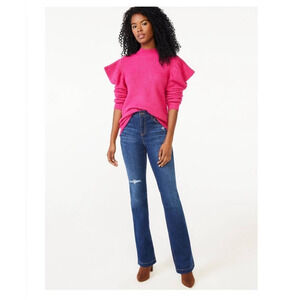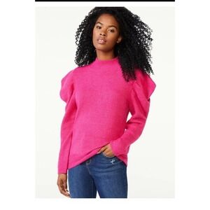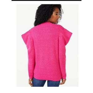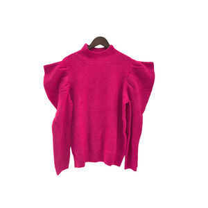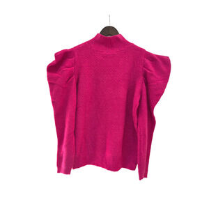 Mock Neck Hot Pink Puff Sleeve Waffle Knit Textured Cozy Sweater Size L NWT