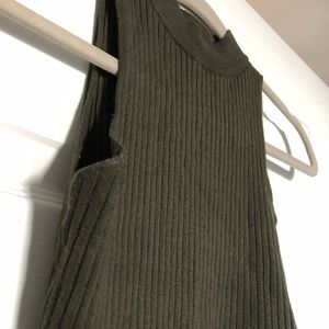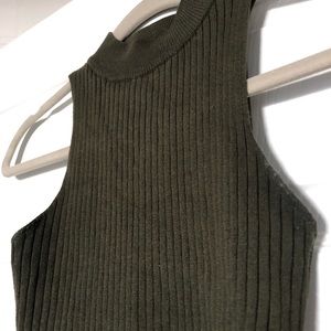 This tank top is fitted and slightly cropped with a high mock neck style. The fabric is ribbed and stretchy. Color is a dark olive green.