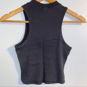 This is a black cropped tank top in a ribbed stretch material. It is super stretchy and comfortable and it is a super versatile piece!!! It is in good condition and can be styled up or down!