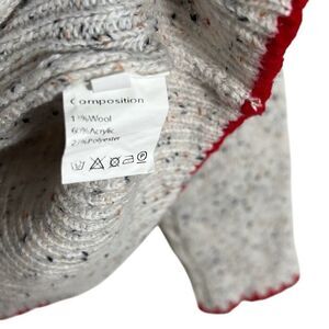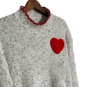 Mock Neck Speckled Ribbed Crochet Heart Pullover Sweater Light Gray Red Medium