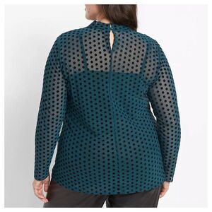 Mock neck. Long sleeves. Mesh with velvet flocked dots. Double-button keyhole back closure. Slightly longer length. Layering cami sold separately.