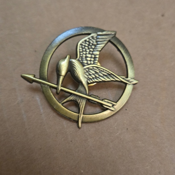 This pre-owned gold mockingjay pin from The Hunger Games is for sale, I am unsure of the metal type or brand besides it being from The Hunger Games, but I'm assuming it's from either Etsy or Amazon. There is some wear on the back of the pin.