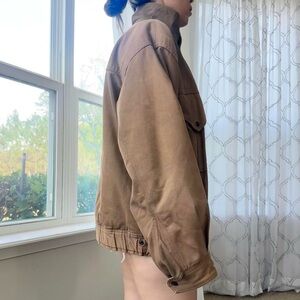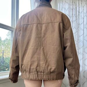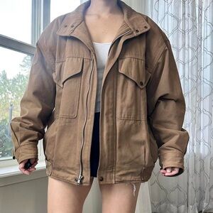 100% cotton mock/funneck neck jacket in a tan color.