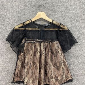 Mod Blouse Women S Small Black Lined Crochet Round Neck Short Sleeve Hook & Eye