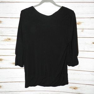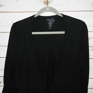 Mod Bod Low Cut V Neck Mid Sleeve Cardigan, Size L, color black, approximate measurements shoulder to shoulder 17", pit to pit 21", about 24" long, all measurements are taken flat by hand, please ask if you have questions