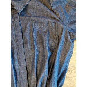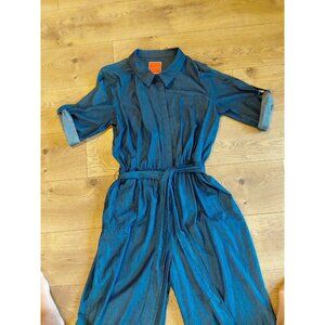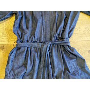 The Mod Cloth Chambray Jumpsuit in XL size is a versatile and stylish one-piece outfit. Made of 100% cotton chambray fabric, this wide-leg jumpsuit features a collared neckline, tie waist closure, and roll tab sleeves for a trendy look. The solid blue color adds a pop of interest to your wardrobe, while the pockets add a practical touch. Bodice has buttons. Chest measures 44" Waist is elastic 30" and will stretch. Perfect condition.