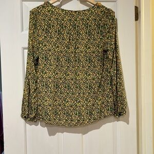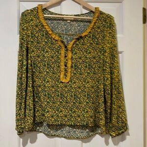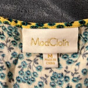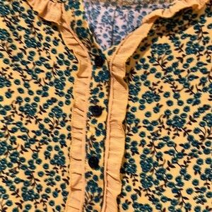 Mod Cloth. Size Medium. Button down partially in front. Button cuffs. Ruffles at neck line and placket. Rayon.